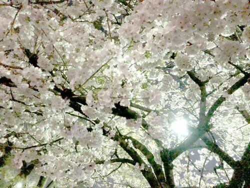 近所の公園で満開の桜がある 夜二人で眺める どういう条件でこのような時期に満開なのか不明 しかし結構きれい 夜桜